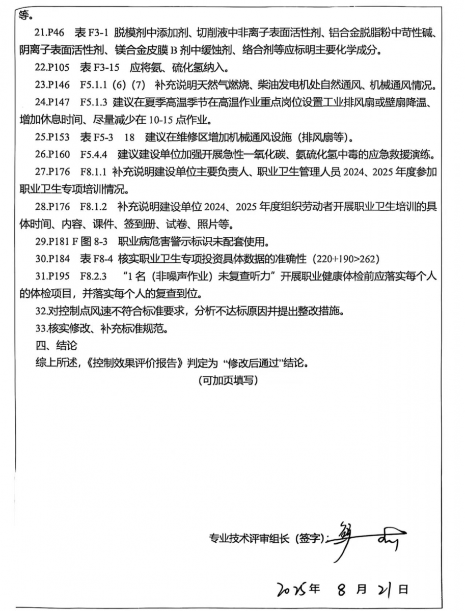 结论:项目控制效果评价判定为“职业病危害风险分类严重”的建设项目。 根据对本项目现场调查、职业病危害因素检测结果和项目相关资料的综合分析,本项目职业卫生防治工作基本符合国家法律、法规的相关规定,采取的职业病防治措施基本可行,日常运行过程中在一定程度上能控制和降低职业病危害因素对作业人员健康的影响,项目在落实了本次评价报告提出的补充措施和建议后,能够满足职业病防治工作的需要。本项目已具备职业病防护设施竣工验收的条件。 建议: