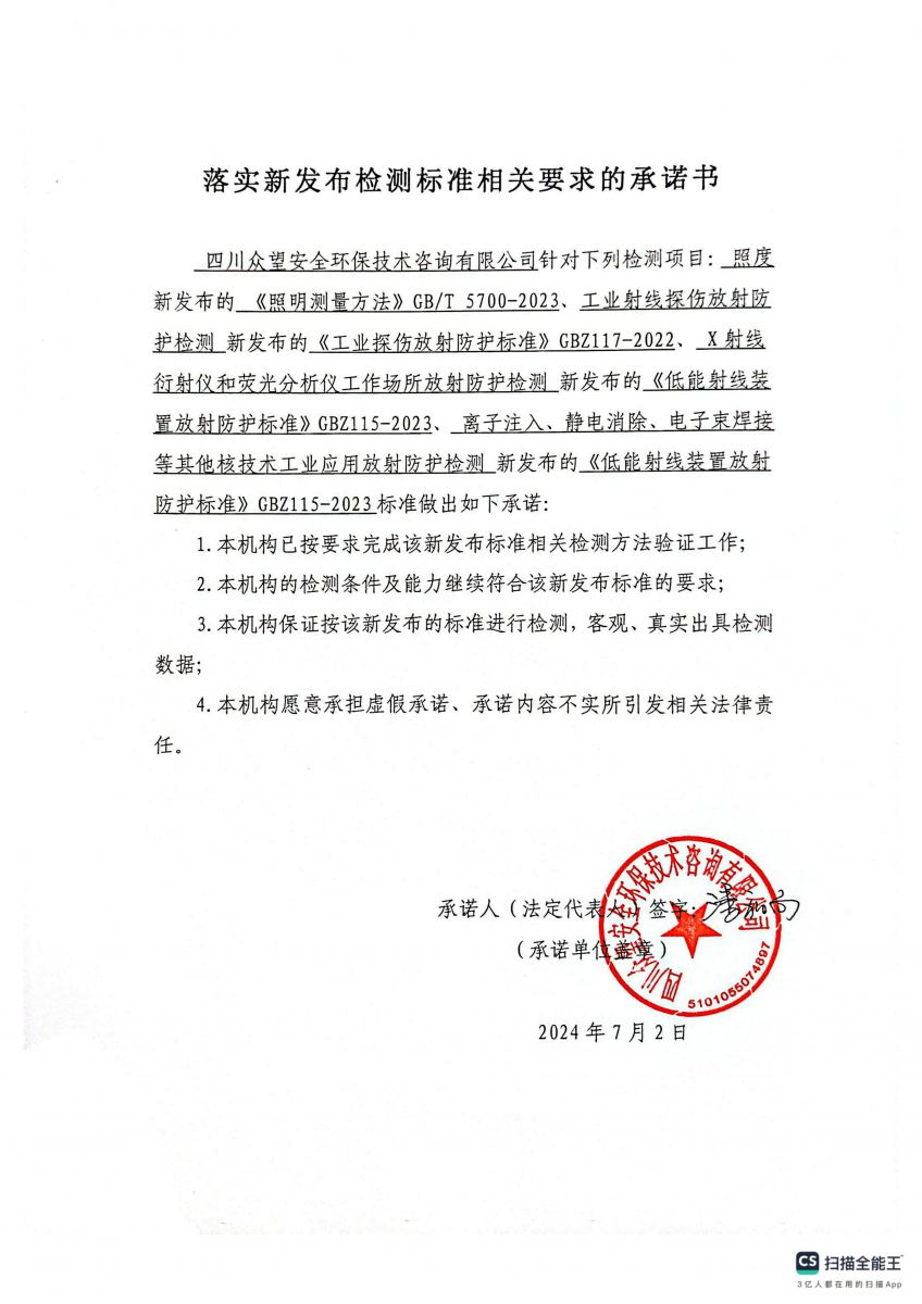 当前所在的位置:网站首页 > 检测中心落实照度、工业射线探伤放射防护检测、X射线衍射仪和荧光分析仪工作场所放射防护检测、离子注入、静电消除、电子東焊接等其他核技术工业应用放射防护检测新发布检测标准相关要求的承诺书