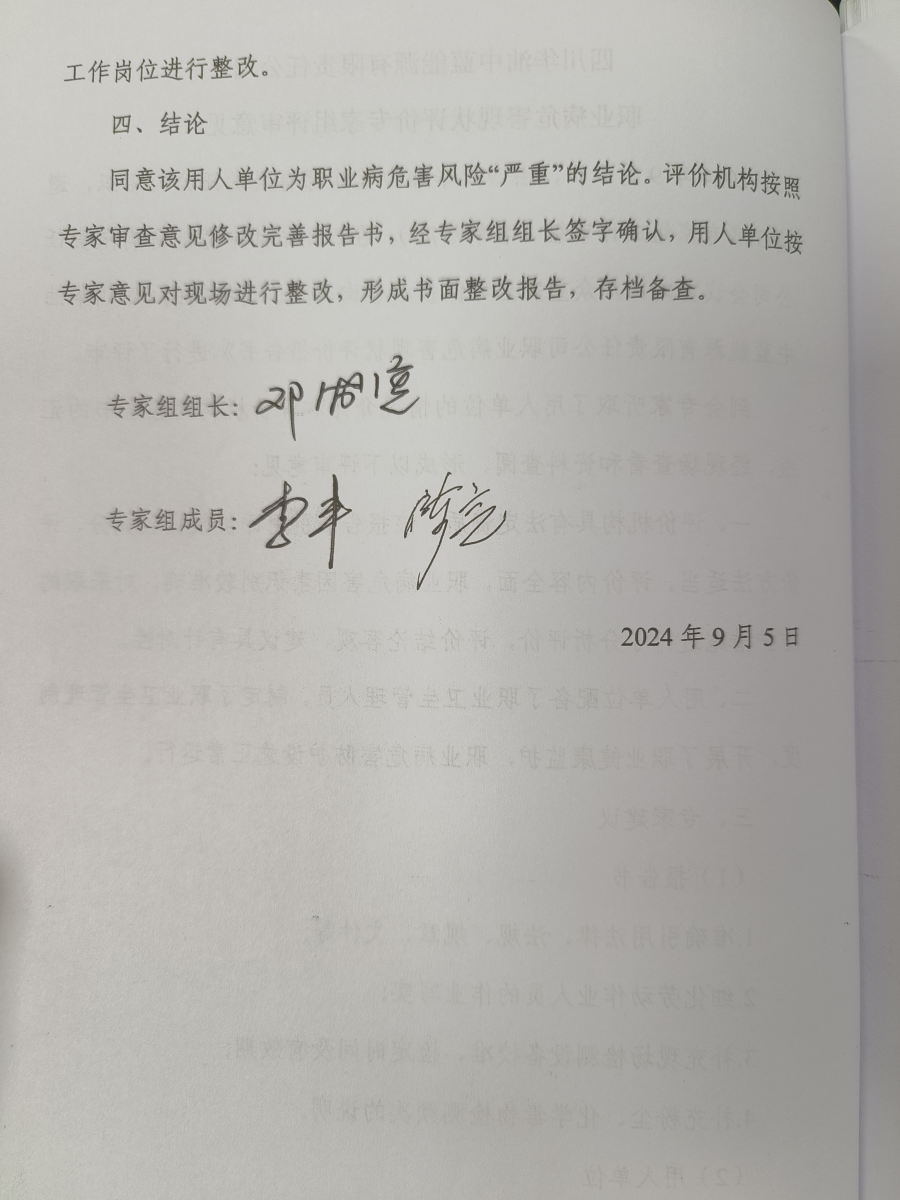(2)建议用人单位应严格执行上岗前、在岗期间、离岗时的职业体检制度,依据《职业健康监护技术规范》(GBZ188-2014)的相关要求组织体检,体检结果应书面告知员工,体检结果有异常的,须及时进行复查,复查结果仍然有异常的须按规定进行诊疗,并做妥善安排。 (3)对准备脱离所从事的职业病危害作业或者岗位的劳动者,用人单位应当在劳动者离岗前30日内组织劳动者进行离岗时的职业健康检查。劳动者离岗前90日内的在岗期间的职业健康检查可以视为离岗时的职业健康检查。对需要复查的劳动者,用人单位应当按照职业健康检查机构要求的时间安排复查和医学观察;不得安排有职业禁忌的劳动者从事其所禁忌的作业,应当调离原工作岗位,并妥善安置。用人单位对未进行离岗时职业健康检查的劳动者,不得解除或者终止与其订立的劳动合同。 (4)建议用人单位根据《职业健康监护技术规范》(GBZ188-2014)要求,组织接触职业病危害的作业人员到具有资质的医疗卫生机构参加体检,体检项目应按照岗位接触的职业病危害因素进行。 (5)建议用人单位外委人员所在单位根据《中华人民共和国职业病防治法》与《职业健康监护技术规范》(GBZ188-2014)的要求,严格执行上岗前、在岗期间、离岗时的职业体检制度。依据外委人员在用人单位从事的工种岗位,组织所有接触职业病危害的外委人员到具有资质的医疗卫生机构参加体检,体检项目应按照岗位接触的职业病危害因素进行。 4职业卫生管理 (1)依据《工作场所职业卫生管理规定》(中华人民共和国国家卫生健康委员会令[2020]第5号)第二十条规定:职业病危害严重的用人单位,应当委托具有相应资质的职业卫生技术服务机构,每年至少进行一次职业病危害因素检测。每三年至少进行一次职业病危害现状评价。检测、评价结果应当存入本单位职业卫生档案,并向卫生主管部门报告和劳动者公布。 (2)用人单位不得将产生职业危害的作业转移给不具备职业病防护条件的单位和个人。不具备职业病防护条件的单位和个人不得接受产生职业病危害的作业。 (3)用人单位与劳动者订立劳动合同(含聘用合同)时,应当将作业过程中可能产生的职业病危害及其后果、职业病防护措施和待遇如实告知劳动者,并在劳动合同中写明,不得隐瞒或者欺骗。 劳动者在履行劳动合同期间因工作岗位或者工作内容变更,从事与所订立的劳动合同中未告知的存在的职业病危害的作业时,用人单位应当依照前款规定,向劳动者履行如实告知义务,并协商变更劳动合同相关条款。 (4)本次职业病危害现状评价,只针对此次调查及检测过程中的生产状况,公司今后的生产状况如果发生改变,导致职业病危害因素变化或增加时,应及时进行职业病危害因素申报及评价。 |