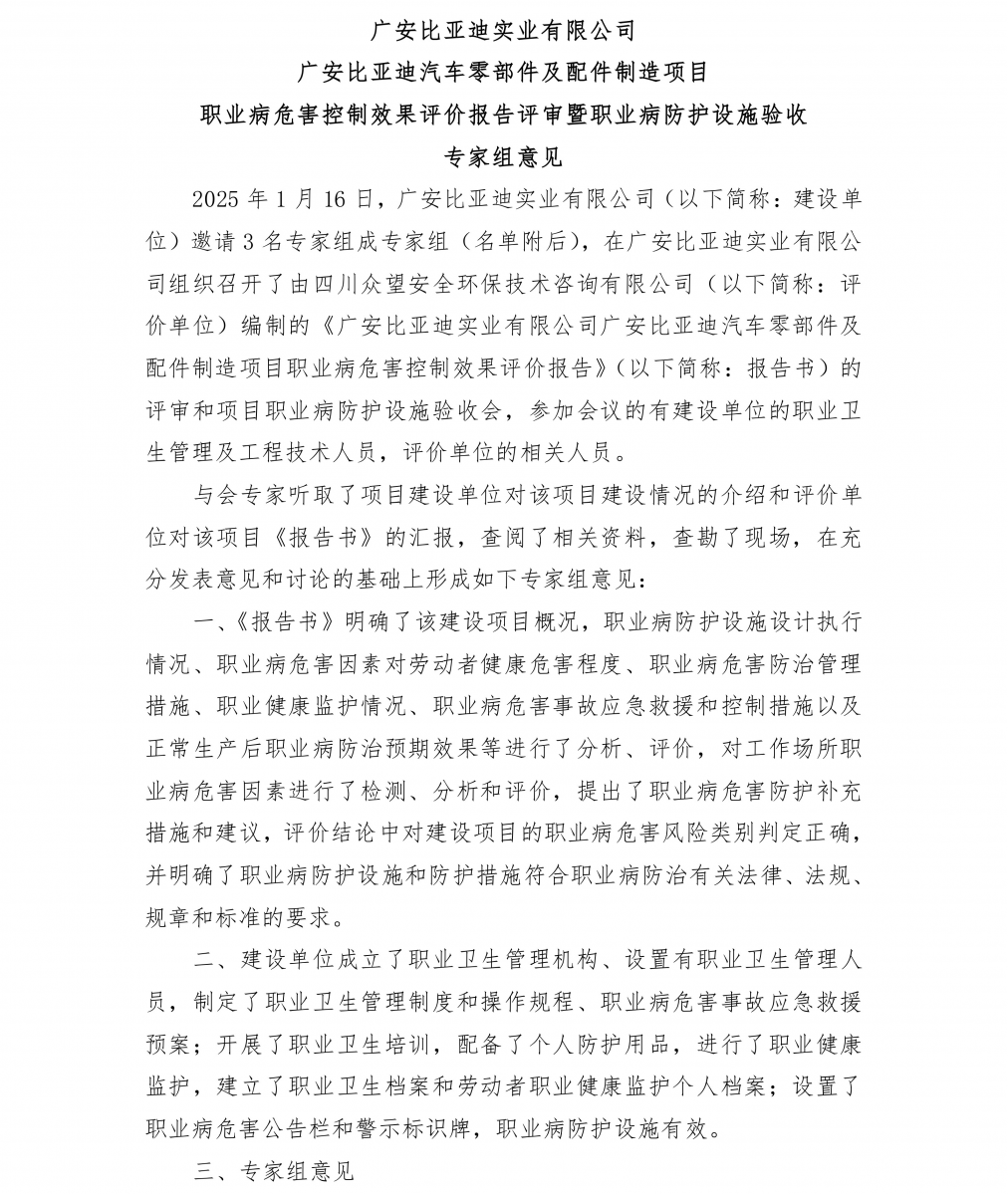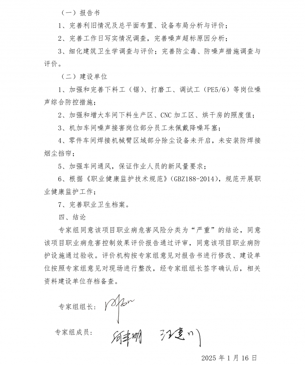 结论:项目控制效果评价判定为“职业病危害风险分类严重”的建设项目。 根据对本项目现场调查、职业病危害因素检测结果和项目相关资料的综合分析,本项目职业卫生防治工作符合国家法律、法规的相关规定,采取的职业病防治措施基本可行,日常运行过程中在一定程度上能控制和降低职业病危害因素对作业人员健康的影响,项目在落实了本次评价报告提出的补充措施和建议后,能够满足职业病防治工作的需要。本项目已具备职业病防护设施竣工验收的条件。 建议: (1)车间加强通风要求,保证作业人员的新风量要求。 (2)根据《职业健康监护技术规范》(GBZ188-2014)结合项目实际情况,做好健康监护工作,“两档”管理制度。“两档”内容包括职业卫生档案和职业健康监护档案。 (3)按照《用人单位职业健康监护监督管理办法》(国家安监总局令〔2012〕第49号)、《职业健康监护技术规范》(GBZ188-2014)相关规定对新进或调岗作业人员进行岗前体检、并对离岗或调离作业人员进行离岗健康检查。 (4)建设单位应按照《工作场所职业卫生管理规定》(国家卫生健康委员会令〔2020〕第5号)的规定:职业病危害严重的用人单位,应当委托具有相应资质的职业卫生技术服务机构,每年至少进行一次职业病危害因素检测,每三年至少进行一次职业病危害现状评价。检测、评价结果应当存入本单位职业卫生档案,并向卫生健康主管部门报告和劳动者公布。 (5)建设单位应根据《职业病危害项目申报办法》(国家安全生产监督管理总局令第48号)的规定,将此次控制效果评价报告与职业病危害因素现场检测结果向当地主管部门进行申报。 (6)根据《国家卫生健康委办公厅关于进一步加强用人单位职业健康培训工作的通知》国卫办职健函〔2022〕441号的要求进行职业卫生培训。 (7)定期对除尘、废气处理设施进行检查、维护,发现有堵塞、损坏或其他原因导致不能正常工作的,应及时进行清理、设备维修,并做好相关维护保养记录。 (8)加强噪声作业人员的个体防护和职业健康监护。 (9)加强外委作业人员的职业卫生管理,对焊工、打磨工加强个体防护和职业健康监护。 (10)建设单位应加强女工的劳动保护,不得安排孕期、哺乳期的女职工从事对本人和胎儿、婴儿有危害的作业。 (11)应急救援物资的使用人员,应接受相应的培训,熟悉装备的用途、技术性能及有关使用说明资料,并遵守操作规程;及时对车间内配备的应急救援药箱进行检查,对应急救援药品进行有效性查验,及时补充更换。 (12)粉尘防爆措施严格以安全评价报告、安全设施设计专篇提出的措施为准。 (13)针对维修、清污存在的受限空间作业危害,应加强受限空间作业监管,严格按照《缺氧危险作业安全规程》(GB8958-2006)、《密闭空间作业职业危害防护规范》(GBZ/T205-2007)进行作业。 (14)本次职业病危害控制效果评价只针对目前生产状况,公司今后遇单位名称、法定代表人或者负责人发生变更,须按时申报;或因技术、工艺或原辅材料发生改变而引起职业病危害因素发生变化时,应进一步进行职业病危害因素评价。 |
