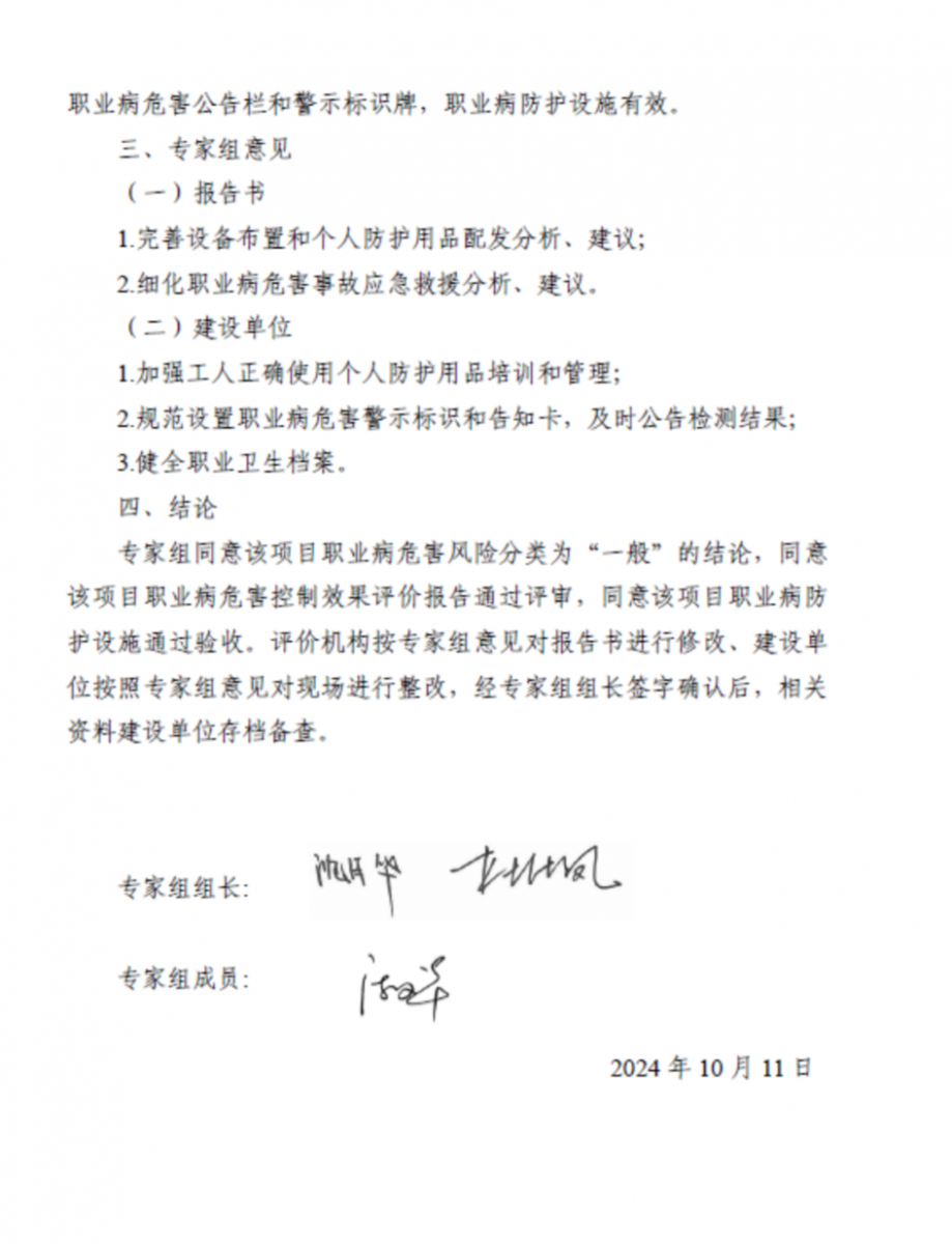 评价结论:根据对本项目现场调查、职业病危害因素检测结果和项目相关资料的综合分析,本项目当前(试运行阶段)基本符合国家和地方对职业病防治方面法律、法规、标准的要求,本项目已具备职业病防护设施竣工验收的条件。在生产状况正常,职业病危害防护设施运行有效,工人佩戴合理有效的个体防护用品,其实际接触的职业病危害因素的浓度/强度能够控制在职业接触限值内,且采取了控制效果评价报告所提对策措施和建议的情况下,符合国家和地方对职业病防治方面法律、法规、标准的要求。 建议: 1.1职业卫生管理 1、该项目应定期委托有资质的检测机构对工作场所内职业病危害因素进行一次定期检测,并对每次职业病危害因素检测结果公示。 2、用人单位外委具有职业病危害的作业时,应书面告知给承包商工作场所存在的职业病危害以及相关要求,并采取措施达到防护条件,或配备个人职业病防护用品。 3、定期对在岗期间的劳动者进行职业卫生培训,根据实际情况制定培训计划,确定培训周期。做好记录及存档工作。 4、本项目竣工验收后,建设单位应按照本报告书识别的职业病危害因素进行申报。 5、该用人单位在作业场所设置了完善的警示标识,今后每半年至少应对其进行一次检查,发现有破损、脱落、褪色、变形等不符合要求时,应按照《工作场所职业病危害警示标识》(GBZ158-2003)相关规定进行修整更换。 1.2个人防护用品 用人单位应当进一步完善个人防护用品的发放周期及使用监管内容,加强作业人员防护用品佩戴监督,定期更换防护用品。 1.3职业健康监护 该项目生产作业人员体检因素还需进一步完善,将视屏作业纳入职业健康体检范畴。建议建设单位按照《职业健康监护技术规范》(GBZ188-2014)相关规定,组织接触职业病危害因素的作业人员到具有职业健康体检资质的医院进行在岗期间职业健康体检,对新进员工进行岗前体检,对离岗人员进行离岗体检。 建设单位应按《中华人民共和国职业病防治法》中华人民共和国主席令〔2018〕第24号和《职业健康监护技术规范》(GBZ188-2014)相关规定全面履行职业健康监护工作,对新进作业人员进行岗前体检、并对离岗或调离作业人员进行离岗健康检查,根据体检结果对作业人员按照《职业病防治法》等法律法规进行合理处置。 1.4外包作业建议 1、督促外包单位安排本项目维护检修人员完善职业健康体检项目。 2、对外包单位维护检修作业劳动过程中职业病防护设施使用情况和个人防护用品佩戴进行监督。 1.5应急救援建议 该项目存在六氟化硫急性中毒、职业中暑、一氧化碳急性中毒,建议建设单位进行六氟化硫急性中毒、一氧化碳急性中毒、职业中暑应急演练并加强应急救援防护。